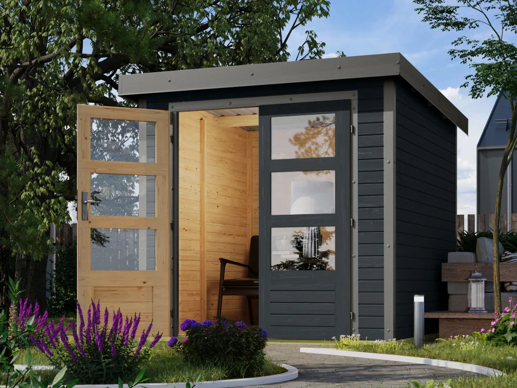 Die Grundfläche des Gartenhauses beträgt 4,45 m². Eine optimale Raumnutzung wird dank einer Firsthöhe von 208,5 cm gewährt.