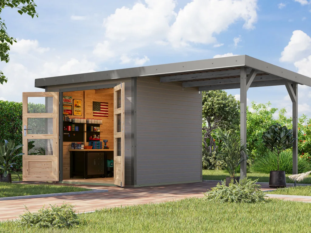 Gartenhaus Jupiter 3 19 mm wassergrau - graualuminium mit Anbaudach 2,35 m breit