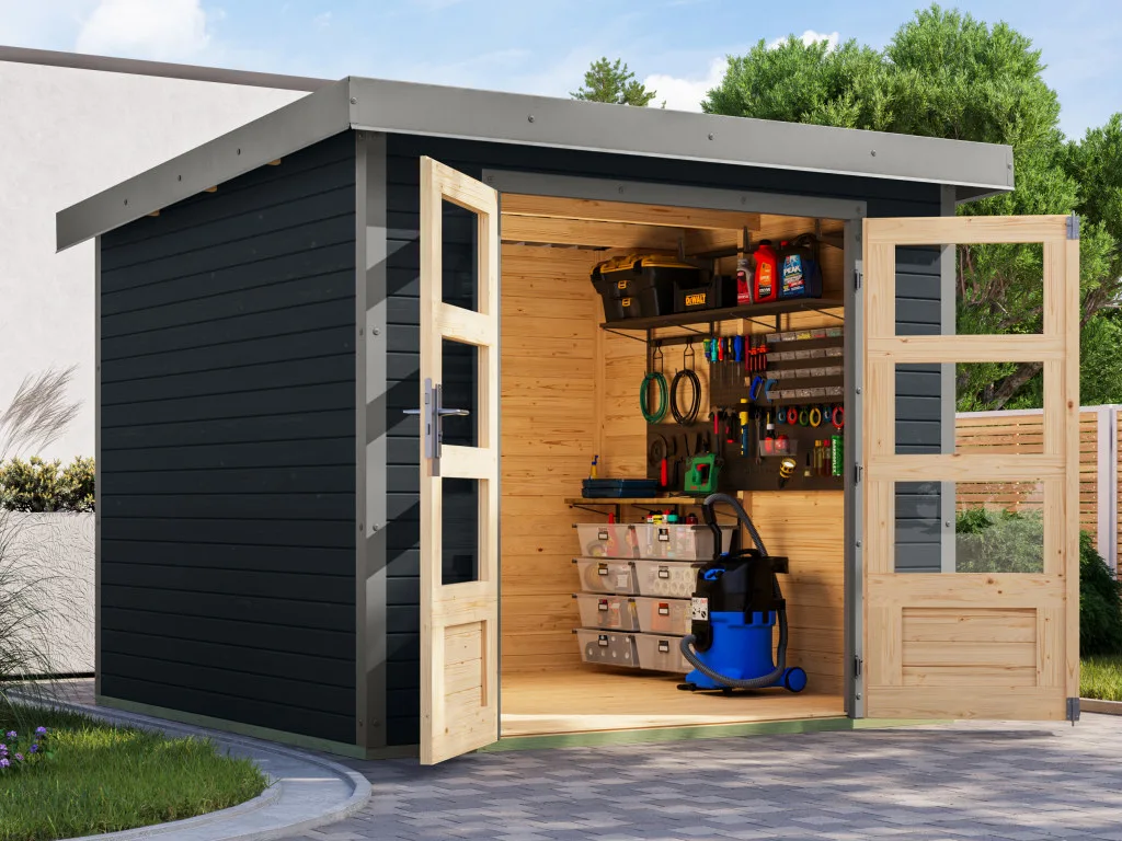 Ein modernes Pultdach verleiht deinem Gartenhaus eine stilvolle, elegante Optik. Durch nur eine geneigte Dachfläche ist die Nutzungsfläche im Inneren des Gartenhauses deutlich weniger eingeschränkt und der Verlust an Nutzraum gering. Zudem lässt die Neigungsseite des Pultdaches das Regenwasser gut abfließen und es ist die Montage von nur einer Regenrinne nötig. Des Weiteren sparst du dir Zeit und Geld bei der Montage des Daches. Durch die mitgelieferten Trapezbleche für das Dach muss kein weiteres Dachmaterial zur Eindeckung gekauft werden. Außerdem lassen sich die Platten schneller verlegen als Rauspund oder Spanplatten.