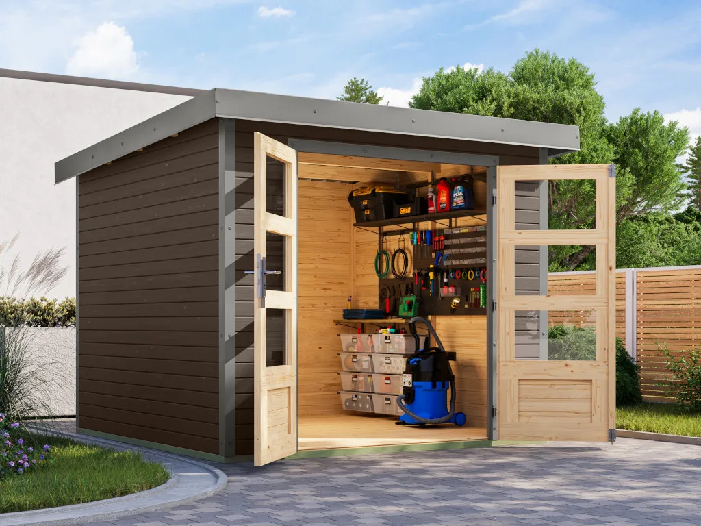 Ein modernes Pultdach verleiht deinem Gartenhaus eine stilvolle, elegante Optik. Durch nur eine geneigte Dachfläche ist die Nutzungsfläche im Inneren des Gartenhauses deutlich weniger eingeschränkt und der Verlust an Nutzraum gering. Zudem lässt die Neigungsseite des Pultdaches das Regenwasser gut abfließen und es ist die Montage von nur einer Regenrinne nötig. Des Weiteren sparst du dir Zeit und Geld bei der Montage des Daches. Durch die mitgelieferten Trapezbleche für das Dach muss kein weiteres Dachmaterial zur Eindeckung gekauft werden. Außerdem lassen sich die Platten schneller verlegen als Rauspund oder Spanplatten.