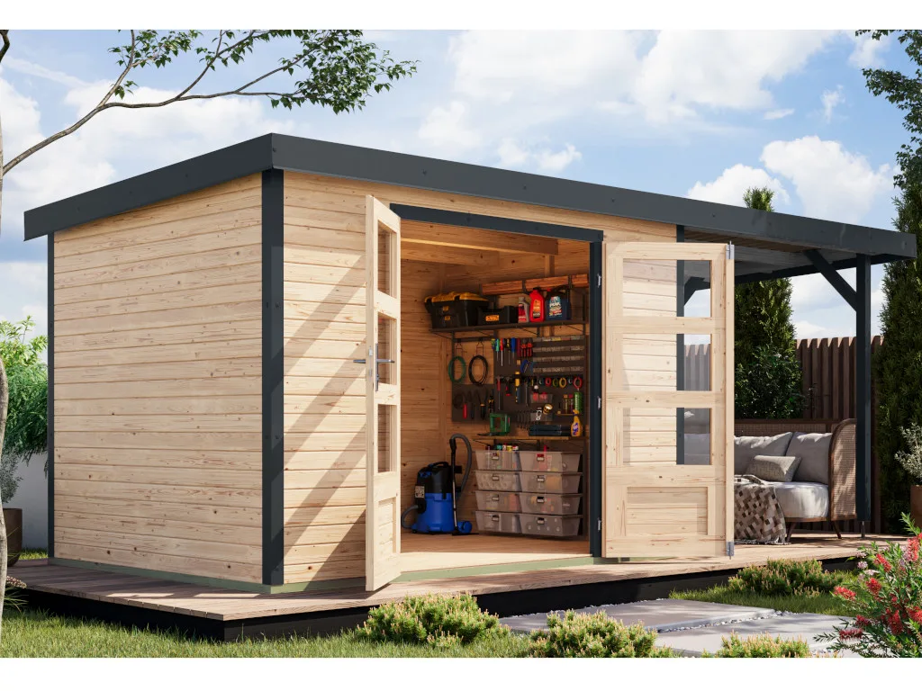 Gartenhaus Jupiter 4 19 mm naturbelassen - anthrazit mit Anbaudach 2,35 m breit