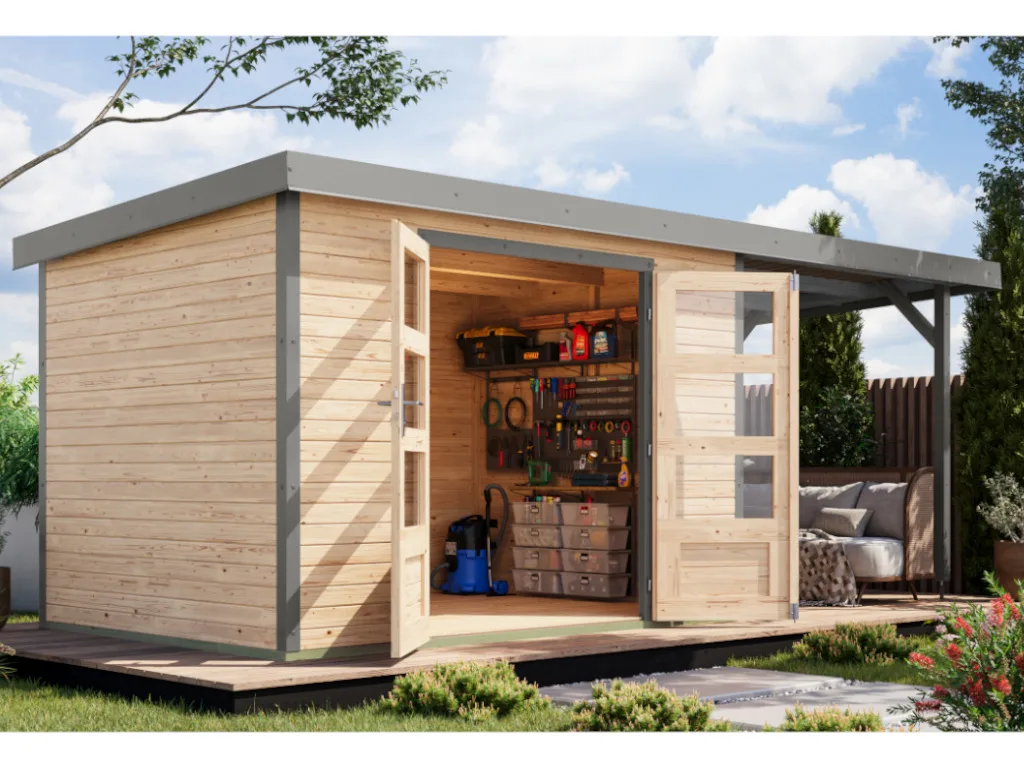 Gartenhaus Jupiter 4 19 mm naturbelassen - graualuminium mit Anbaudach 2,35 m breit