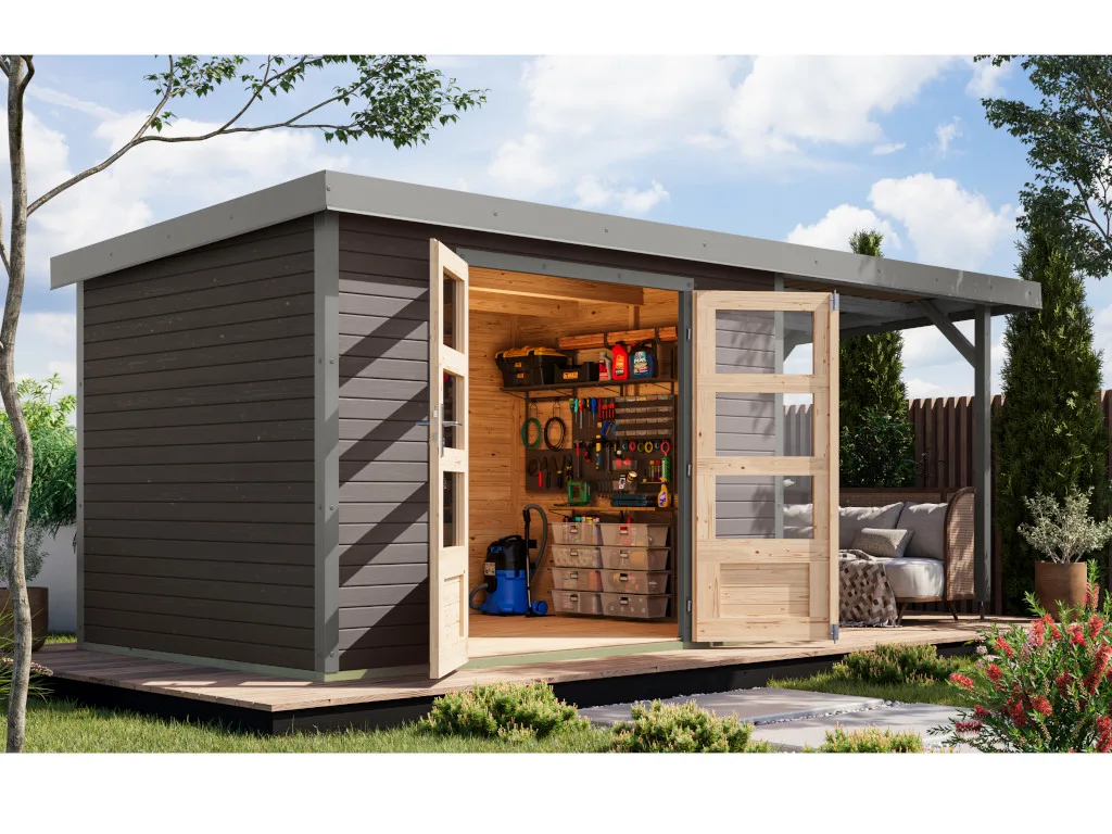 Im Vergleich zu herkömmlichen Holzgartenhäusern sind Hybridhäuser von Karibu erheblich wartungsärmer. Die Stahlecken schützen besonders gut vor Witterung und die Häuser überzeugen durch ihre moderne Optik.