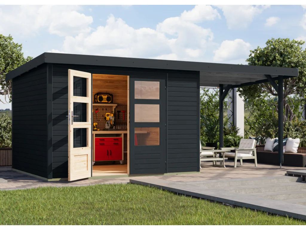 Gartenhaus Jupiter 5 19 mm anthrazit - anthrazit mit Anbaudach 2,35 m breit