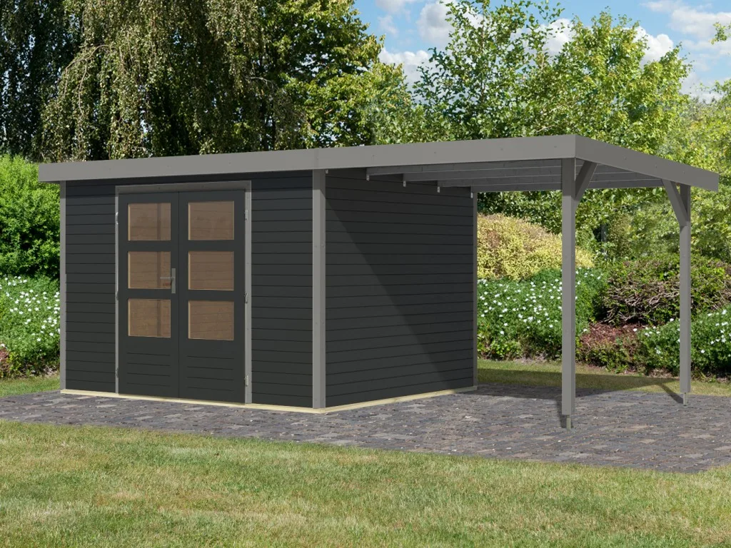 Gartenhaus Jupiter 5 19 mm anthrazit - graualuminium mit Anbaudach 2,35 m breit