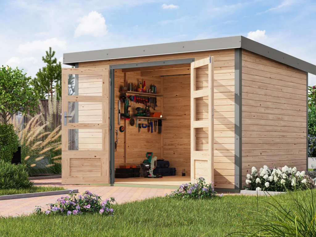 Ein modernes Pultdach verleiht deinem Gartenhaus eine stilvolle, elegante Optik. Durch nur eine geneigte Dachfläche ist die Nutzungsfläche im Inneren des Gartenhauses deutlich weniger eingeschränkt und der Verlust an Nutzraum gering. Zudem lässt die Neigungsseite des Pultdaches das Regenwasser gut abfließen und es ist die Montage von nur einer Regenrinne nötig. Des Weiteren sparst du dir Zeit und Geld bei der Montage des Daches. Durch die mitgelieferten Trapezbleche für das Dach muss kein weiteres Dachmaterial zur Eindeckung gekauft werden. Außerdem lassen sich die Platten schneller verlegen als Rauspund oder Spanplatten.