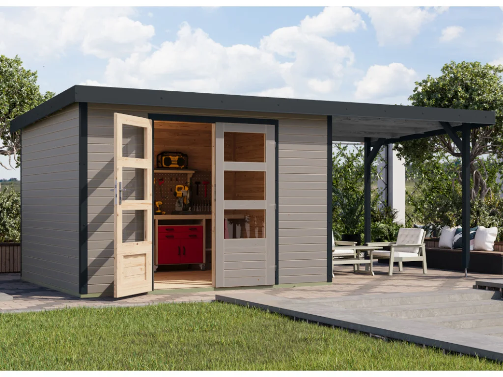Gartenhaus Jupiter 5 19 mm wassergrau - anthrazit mit Anbaudach 2,35 m breit