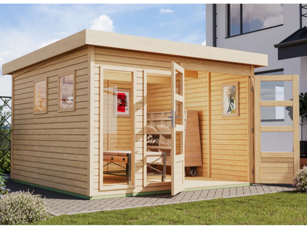 | Bauweise Gartenhäuser aus Holz sind in drei verschiedenen Bauweisen erhältlich: Blockbohlenbauweise, Systembauweise, Elementbauweise. | Steck-/Schraubsystem |