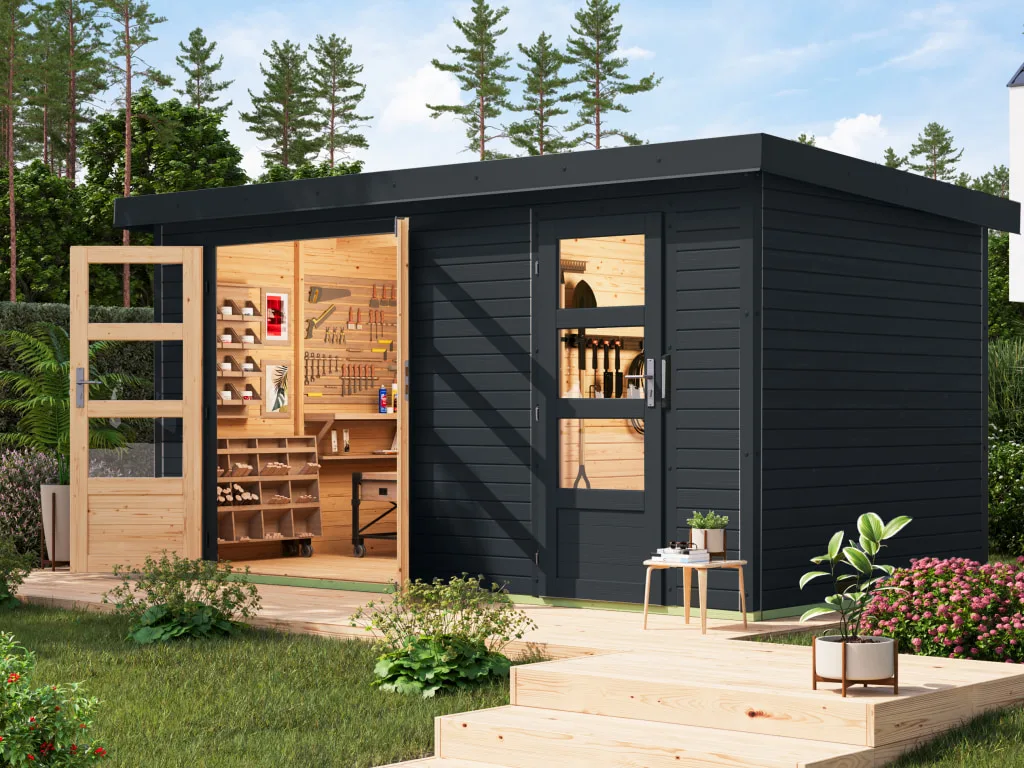 Im Vergleich zu herkömmlichen Holzgartenhäusern sind Hybridhäuser von Karibu erheblich wartungsärmer. Die Stahlecken schützen besonders gut vor Witterung und die Häuser überzeugen durch ihre moderne Optik.