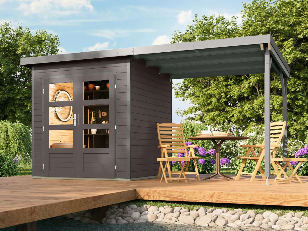 Gartenhaus Pluto 1 28 mm SET terragrau / graualuminium mit Anbau