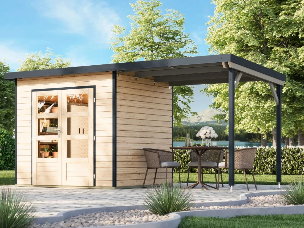 Gartenhaus Pluto 2 28 mm SET naturbelassen / anthrazit mit Anbau