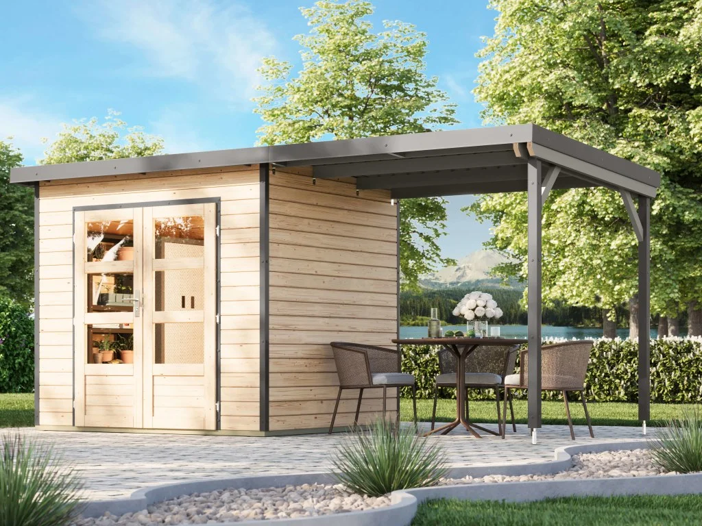 Gartenhaus Pluto 2 28 mm SET naturbelassen/ graualuminium mit Anbau