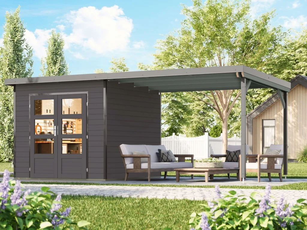 Gartenhaus Pluto 3 28 mm SET terragrau / graualuminium mit Anbau