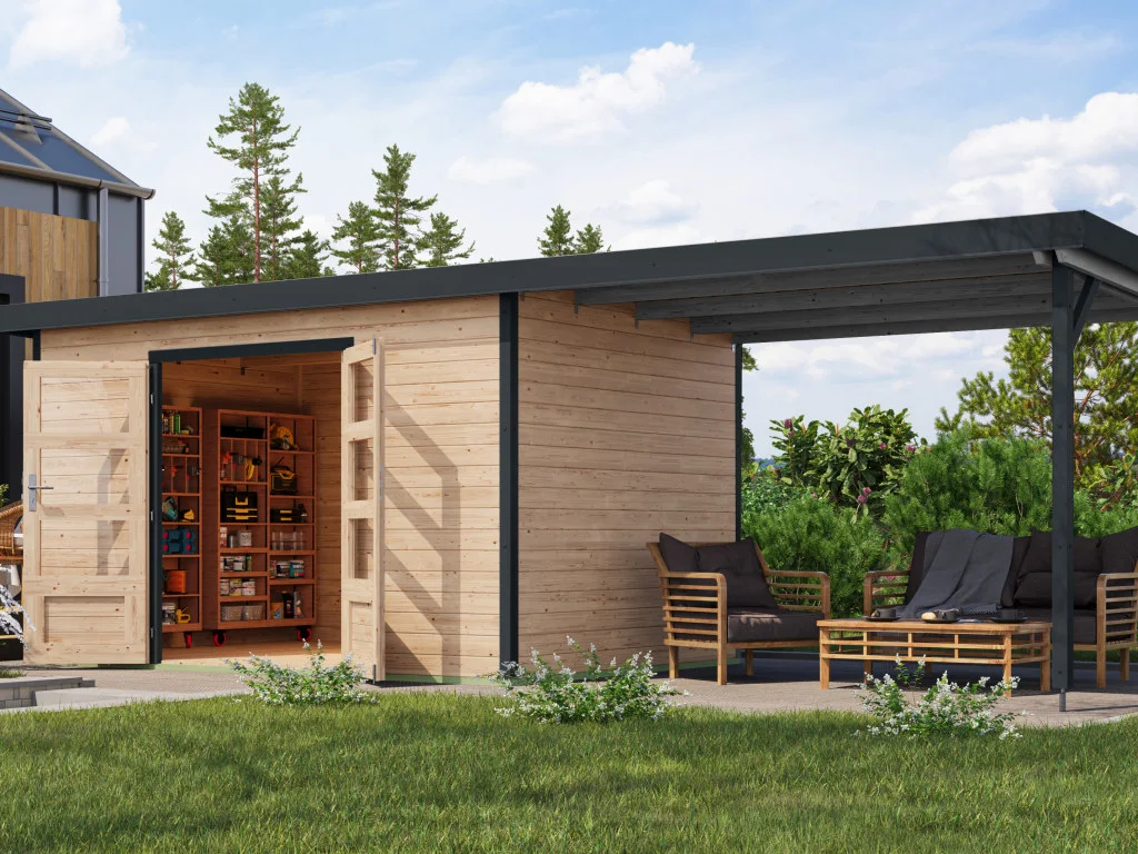 Gartenhaus Pluto 7 28 mm naturbelassen - anthrazit mit Anbaudach ca. 3 m breit