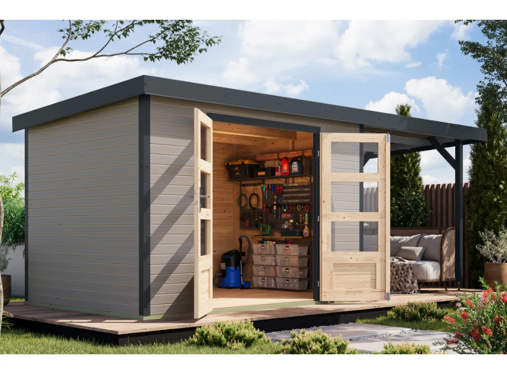 Gartenhaus Jupiter 4 19 mm wassergrau - anthrazit mit Anbaudach 2,35 m breit