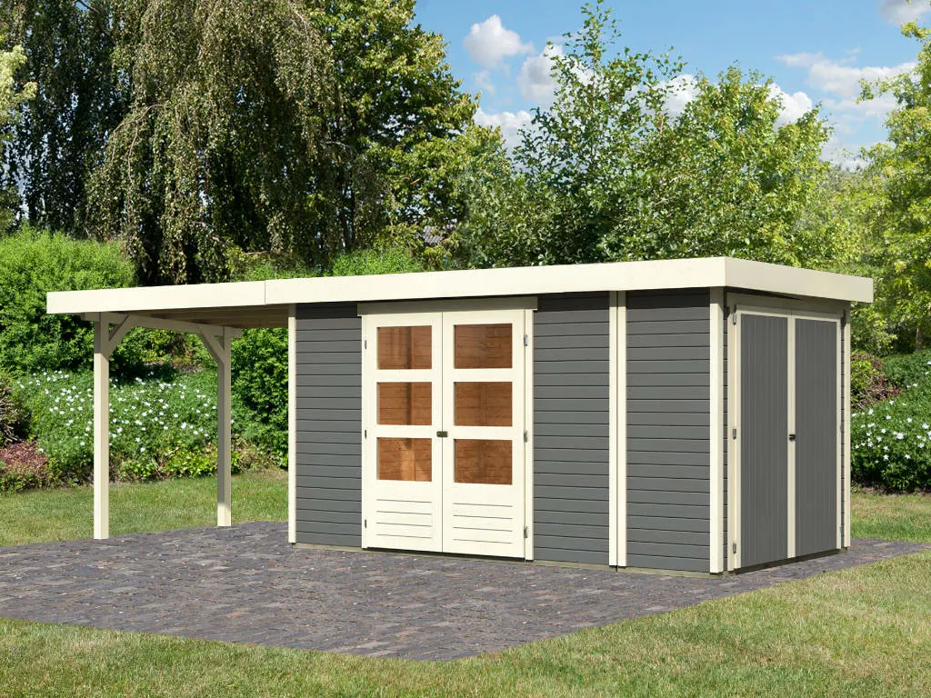 Für besonders viel Stauraum sorgt das Gartenhaus dank Anbauschrank, der mitgeliefert wird. Das Anbaudach und der zusätzliche Anbauschrank eignen sich optimal als Lagerplatz für Gartenmöbel und Gartenutensilien. Durch die Überdachung sind diese stets vor Regen und Sonne geschützt.