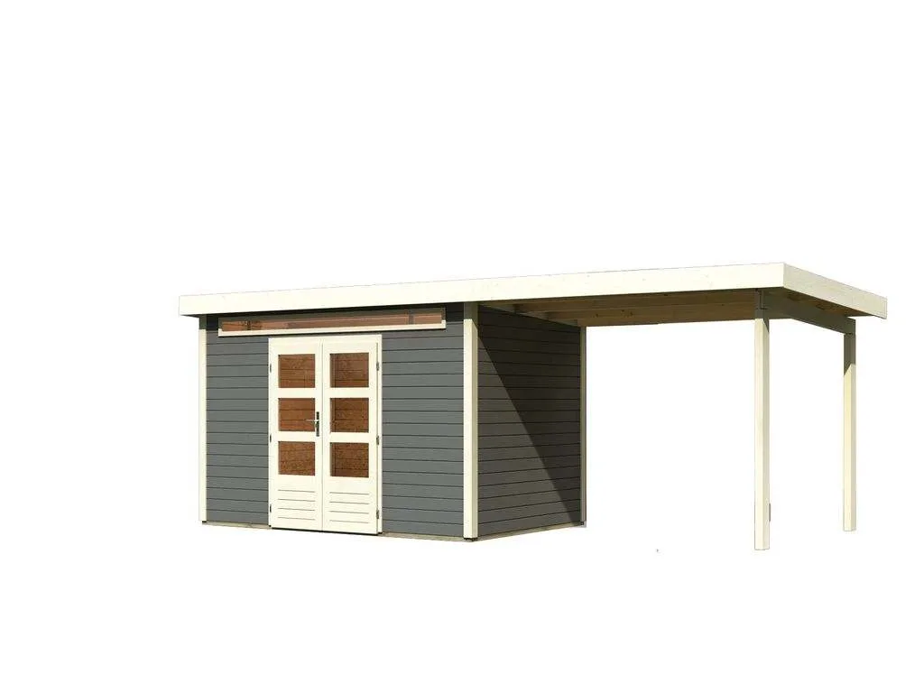 Für mehr Raum und vielfältige Nutzungsmöglichkeiten sorgt dieses Gartenhaus mit Anbaudach. Das großzügig geschnittene Anbaudach ermöglicht es, den Gartenalltag in vollen Zügen im Freien genießen zu können ? geschützt vor Sonne, Wind und Regen. Der Platz unter dem Dach kann als gemütliche Terrasse zum Sitzen, Spielen oder Werkeln bei jedem Wetter genutzt werden. Alternativ eignet es sich auch als optimaler Unterstellplatz für zahlreiche Gartengeräte.