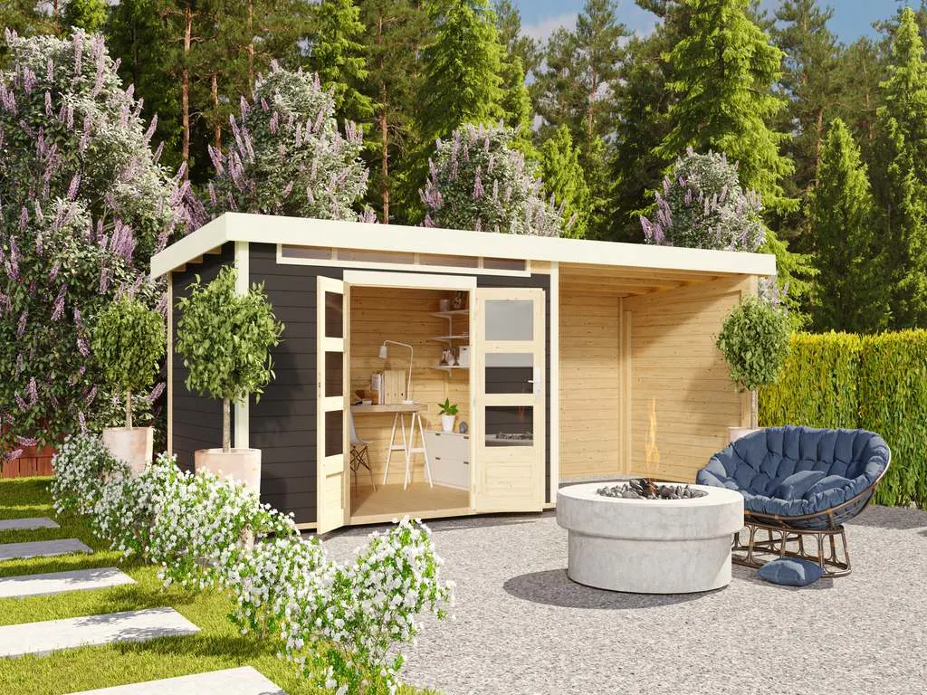Das Gartenhaus mit Anbaudach und Rückwand ist sehr vielseitig. Der durch das Anbaudach geschaffene zusätzliche Stauraum eignet sich optimal als Lagerplatz für Gartenutensilien oder als Sitzbereich zum gemütlichen Verweilen. Dank Überdachung und integrierter Rückwand sind Geräte und Gartenmöbel optimal vor Wind und Wetter geschützt.