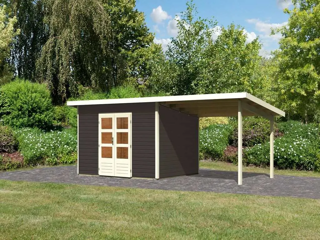 Für mehr Raum und vielfältige Nutzungsmöglichkeiten sorgt dieses Gartenhaus mit Anbaudach. Das großzügig geschnittene Anbaudach ermöglicht es, den Gartenalltag in vollen Zügen im Freien genießen zu können – geschützt vor Sonne, Wind und Regen. Der Platz unter dem Dach kann als gemütliche Terrasse zum Sitzen, Spielen oder Werkeln bei jedem Wetter genutzt werden. Alternativ eignet es sich auch als optimaler Unterstellplatz für zahlreiche Gartengeräte.