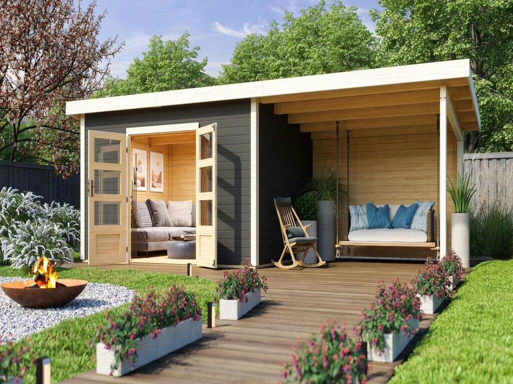 Für mehr Raum und vielfältige Nutzungsmöglichkeiten sorgt dieses Gartenhaus mit Anbaudach. Das großzügig geschnittene Anbaudach ermöglicht es, den Gartenalltag in vollen Zügen im Freien genießen zu können – geschützt vor Sonne, Wind und Regen. Der Platz unter dem Dach kann als gemütliche Terrasse zum Sitzen, Spielen oder Werkeln bei jedem Wetter genutzt werden. Alternativ eignet es sich auch als optimaler Unterstellplatz für zahlreiche Gartengeräte.