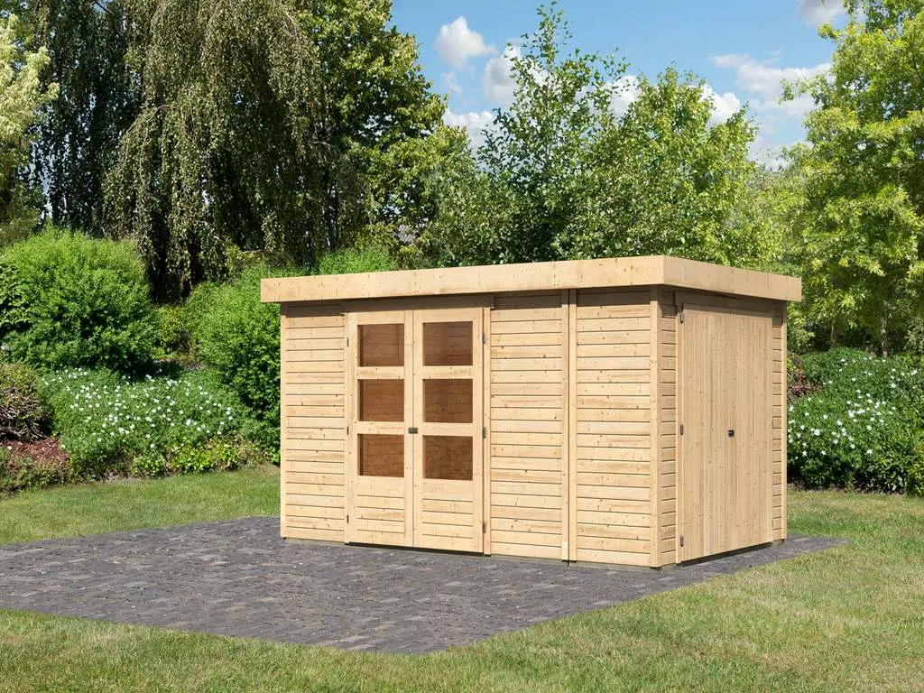 Für besonders viel Stauraum sorgt das Gartenhaus dank Anbauschrank, der mitgeliefert wird. Das Anbaudach und der zusätzliche Anbauschrank eignen sich optimal als Lagerplatz für Gartenmöbel und Gartenutensilien. Durch die Überdachung sind diese stets vor Regen und Sonne geschützt.
