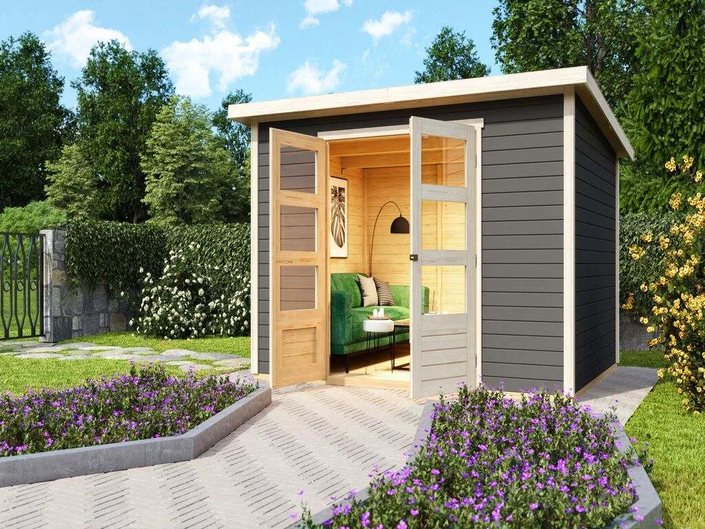 Die Grundfläche des Gartenhauses beträgt 7,28 m². Eine optimale Raumnutzung wird dank einer Firsthöhe von 197 cm gewährt.