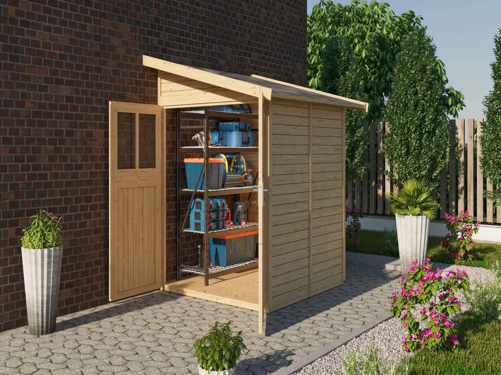 Klein, aber fein – dieses Gerätehaus aus robustem Holz bietet ausreichend Stauraum, ohne dabei viel Platz im Garten einzunehmen. So kannst du deine Geräte ganz leicht witterungsgeschützt und diebstahlsicher verstauen.