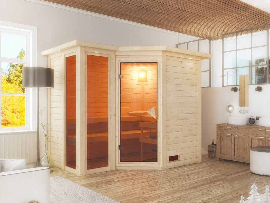 Dieses Saunamodell – eine System- bzw. Elementsauna – zeichnet sich durch seine besondere Sandwich-Bauweise aus, d. h., die Wandelemente bestehen aus einzelnen Schichten. Die bereits vorgefertigten Wandelemente aus Fichte ermöglichen einen schnellen Aufbau innerhalb weniger Stunden. Mit einer Wandstärke von 38 mm sind Systemsaunen optimal isoliert und somit besonders energiesparend. Wegen der sehr gut gedämmten Elemente heizt sich die Systemsauna extra schnell auf.
