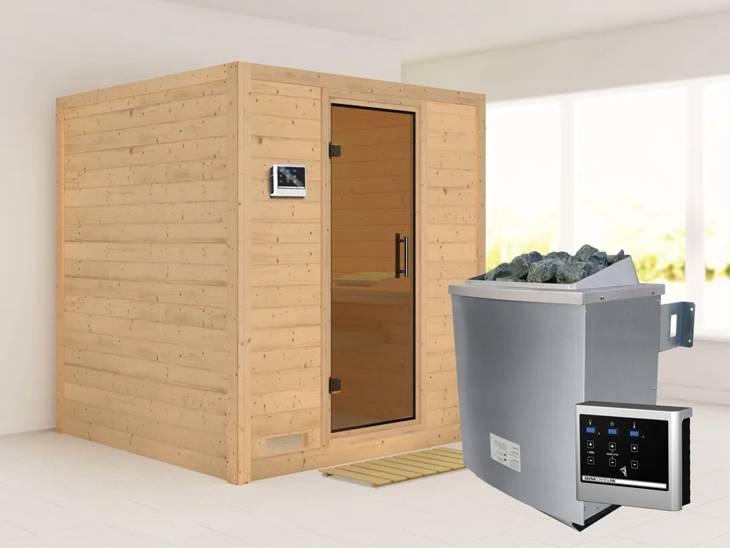 Bei dieser Innensauna ist ein Saunaofen mit einer externen Steuerung inklusive. Das Steuergerät wird außerhalb der Sauna angebracht. Auf diese Weise fängt schon vor dem Saunieren der Komfort an – mit einer bequemen Bedienung von außen und einer noch exakteren Temperatureinstellung. Weitere elektrische Geräte, wie die Kabinenbeleuchtung, können ebenso an die externe Steuerung angeschlossen und bedient werden.