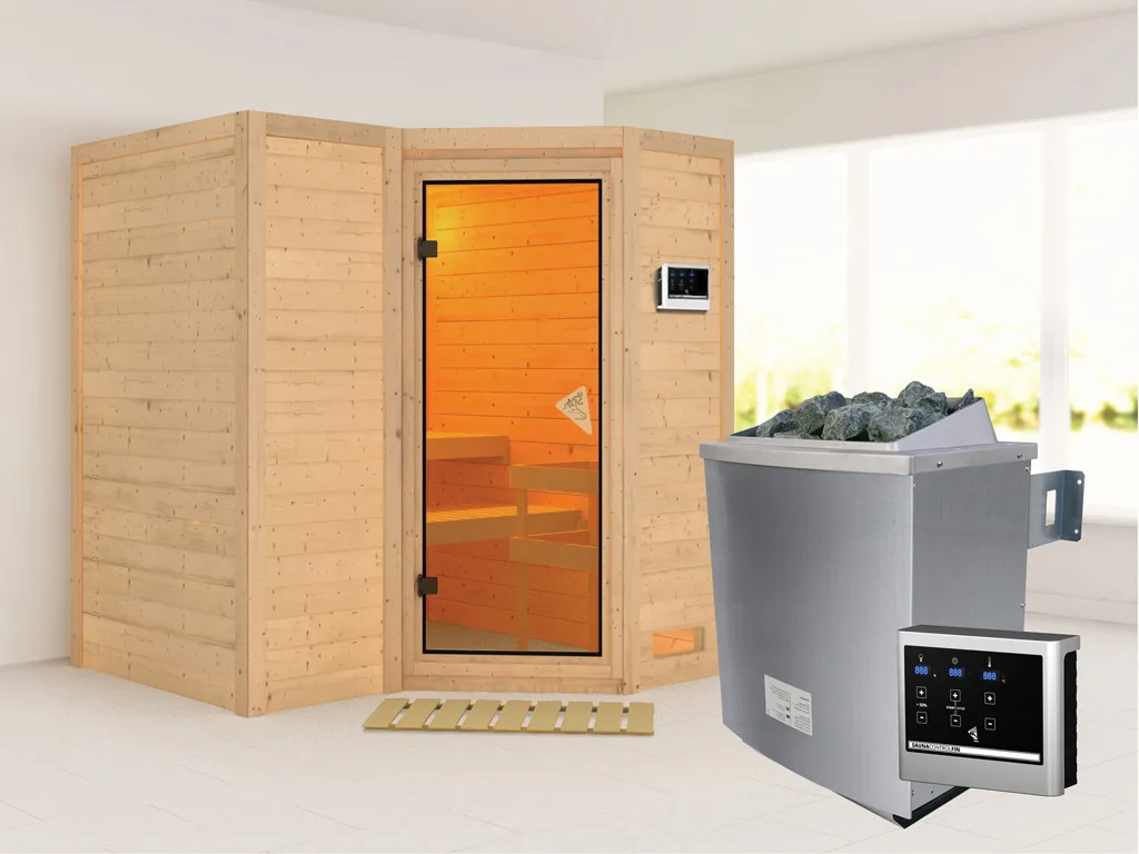 Massivholzsauna Sahib 1 bronzierte Ganzglastür, inkl. 9 kW Ofen ext. Steuerung