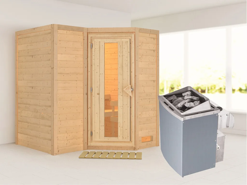 Massivholzsauna Sahib 1 Holztür mit Isolierglas, inkl. 9 kW Ofen integr. Steuerung