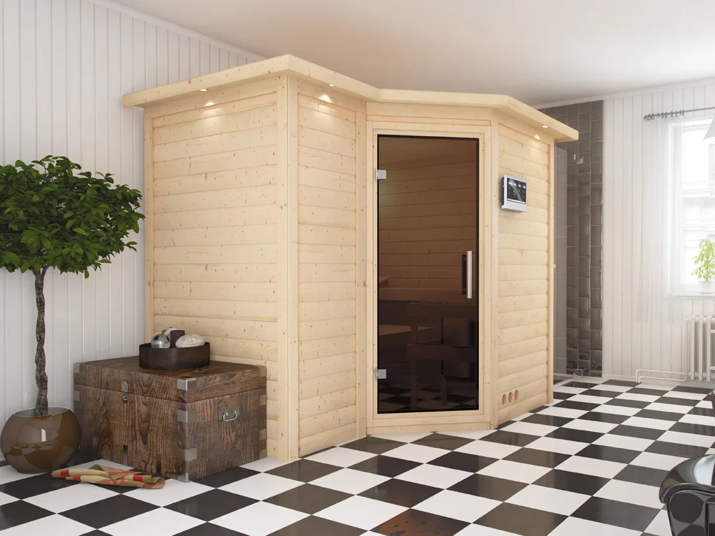 Bei dieser Innensauna ist ein Saunaofen mit einer externen Steuerung inklusive. Das Steuergerät wird außerhalb der Sauna angebracht. Auf diese Weise fängt schon vor dem Saunieren der Komfort an – mit einer bequemen Bedienung von außen und einer noch exakteren Temperatureinstellung. Weitere elektrische Geräte, wie die Kabinenbeleuchtung, können ebenso an die externe Steuerung angeschlossen und bedient werden.