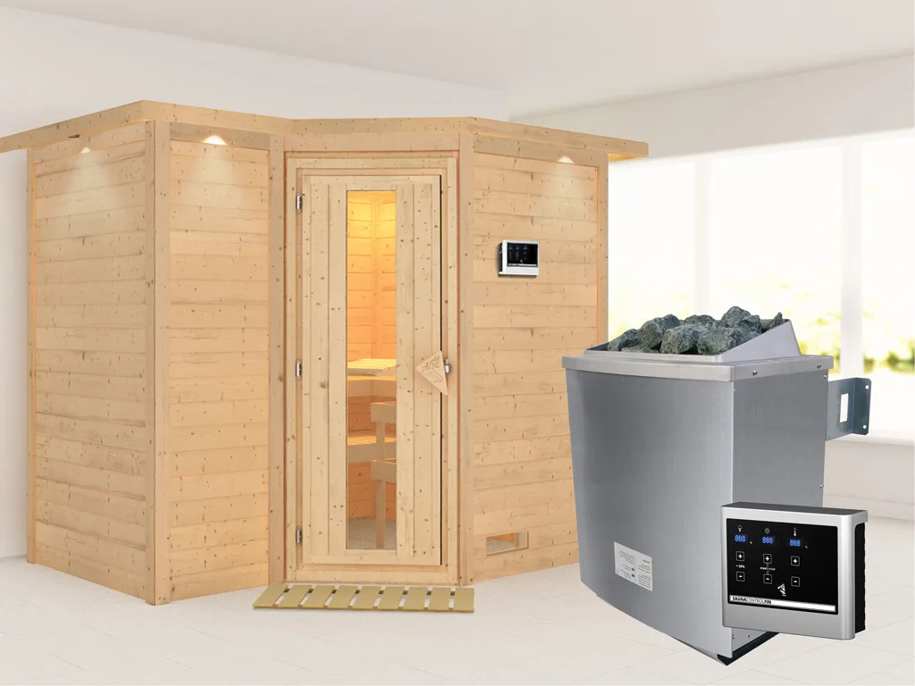 Bei dieser Innensauna ist ein Saunaofen mit einer externen Steuerung inklusive. Das Steuergerät wird außerhalb der Sauna angebracht. Auf diese Weise fängt schon vor dem Saunieren der Komfort an – mit einer bequemen Bedienung von außen und einer noch exakteren Temperatureinstellung. Weitere elektrische Geräte, wie die Kabinenbeleuchtung, können ebenso an die externe Steuerung angeschlossen und bedient werden.