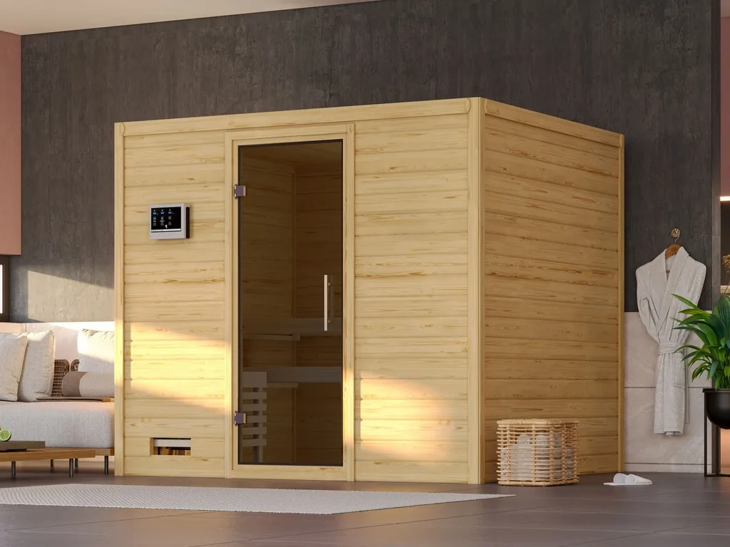 Bei dieser Innensauna ist ein Saunaofen mit einer externen Steuerung inklusive. Das Steuergerät wird außerhalb der Sauna angebracht. Auf diese Weise fängt schon vor dem Saunieren der Komfort an – mit einer bequemen Bedienung von außen und einer noch exakteren Temperatureinstellung. Weitere elektrische Geräte, wie die Kabinenbeleuchtung, können ebenso an die externe Steuerung angeschlossen und bedient werden.
