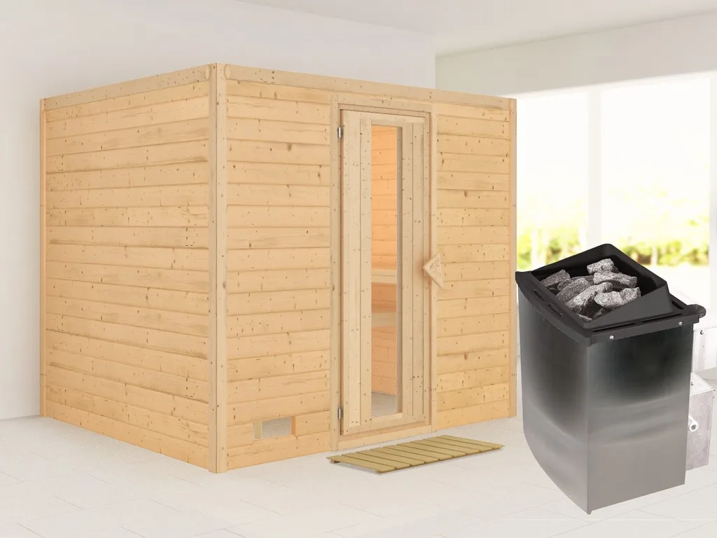 3 Liegen, 9 kW Saunaofen, int. Steuerung, 1 Kopfstütze aus Espenholz, Ofenschutzgitter aus stabilem Fichtenholz. Bodenrost, Montageanleitung.