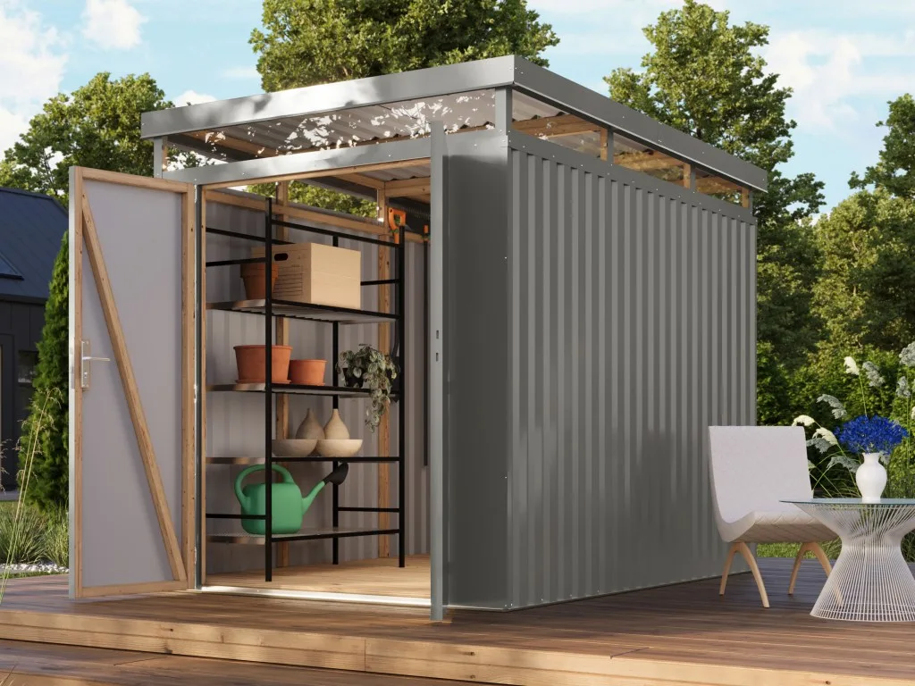 Ein modernes Pultdach verleiht deinem Gartenhaus eine stilvolle, elegante Optik. Durch nur eine geneigte Dachfläche ist die Nutzungsfläche im Inneren des Gartenhauses deutlich weniger eingeschränkt und der Verlust an Nutzraum gering. Zudem lässt die Neigungsseite des Pultdaches das Regenwasser gut abfließen und es ist die Montage von nur einer Regenrinne nötig.