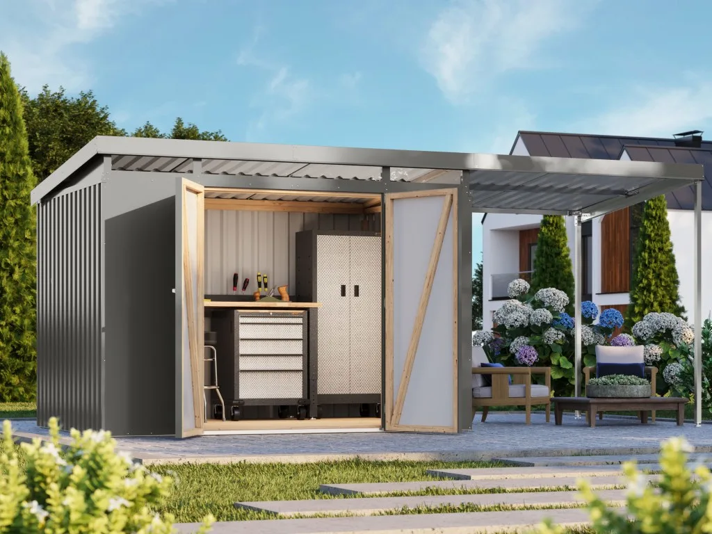 Klein, aber fein – dieses Gerätehaus bietet ausreichend Stauraum, ohne dabei viel Platz im Garten einzunehmen. So kannst du deine Geräte ganz leicht witterungsgeschützt und diebstahlsicher verstauen. Das Häuschen besteht aus verzinktem Metall und ist dadurch besonders langlebig und robust.