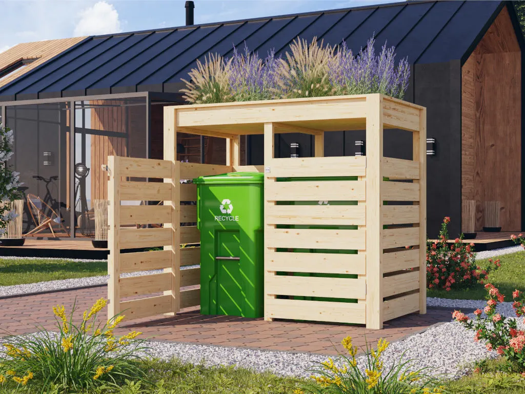 Ein Unterstand ist die perfekte Lösung, um Mülltonnen diskret und ordentlich zu verstecken. Gefertigt aus robustem Holz, ist dieses Modell nicht nur praktisch, sondern auch eine stilvolle, ästhetische Bereicherung für deinen Außenbereich. Mit einem Außenmaß von 158,2 x 87,6 x 143 cm (B x T x H) finden hier mühelos zwei 240-Liter-Mülltonnen Platz. Das integrierte Hochbeet kannst du für die Zucht von Kräutern, Obst oder Gemüsepflanzen nutzen. Eine feuchtigkeitshemmende Kunststofffolie ist im Lieferumfang enthalten.