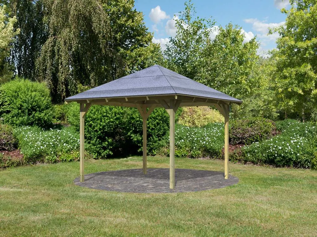 Der sechseckige Pavillon hat ein Außenmaß von 235 x 208 cm und ein Dachstandmaß von 299 x 260 cm. Die Seitenhöhe beträgt 199 cm, der First misst 280 cm. Das formschöne Walmdach wird von 6 Pfosten gestützt, die jeweils 9 x 9 cm stark sind. Die Pfosten und weiteren Sparren Querverbinder sind kesseldruckimprägniert und somit gegen Witterungseinflüsse bestens geschützt. Wir empfehlen die Verwendung von unseren passenden H-Ankern mit einer Länge von 60 cm für die Befestigung im Untergrund.