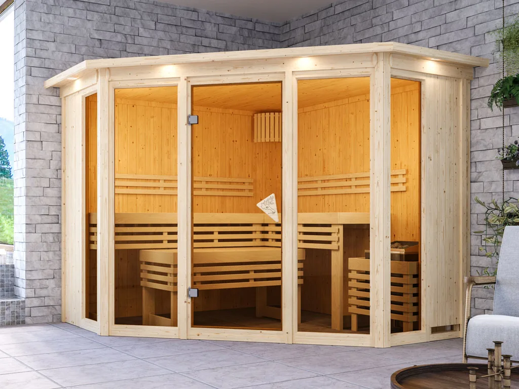 Die Außenwände der Sichtseiten setzen sich zusammen aus zwei 12,5 mm starken atmungsaktiven und feuchtigkeitsausgleichenden Spezial-Softline-Profilholzplatten und einer 42 mm dicken Dämmschicht aus Mineralwolle. Das Dach besteht aus einer 57 mm starken Spezialplatte und Mineralwolldämmung. Aufgrund einer Gesamtwandstärke von 68 mm sind Systemsaunen besonders gut isoliert und benötigen eine sehr geringe Aufheizzeit. Das macht sie besonders energieschonend.