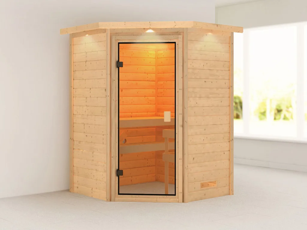• Eckeinstieg: Diese Sauna mit Eckeinstieg eignet sich besonders gut für kleine Räume. Platzsparend und kompakt passt sie in jeden Raum und nutzt die Fläche optimal.