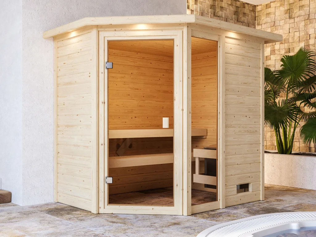 • Eckeinstieg: Saunen dieser Form machen sich besonders gut in kleinen Räumen, da sie platzsparend sind, aber trotzdem viel Freiheit zum Saunieren bieten. Kompakt und in nahezu jeden Raum integrierbar!