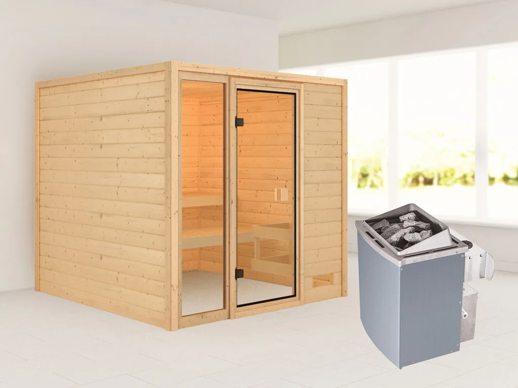 Sauna Jutta mit bronzierter Glastür + 9 kW Saunaofen integr. Strg.