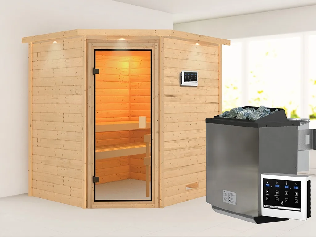 Sauna Massivholzsauna Mia mit Dachkranz, inkl. 9 kW Bio-Ofen mit externer Steuerung