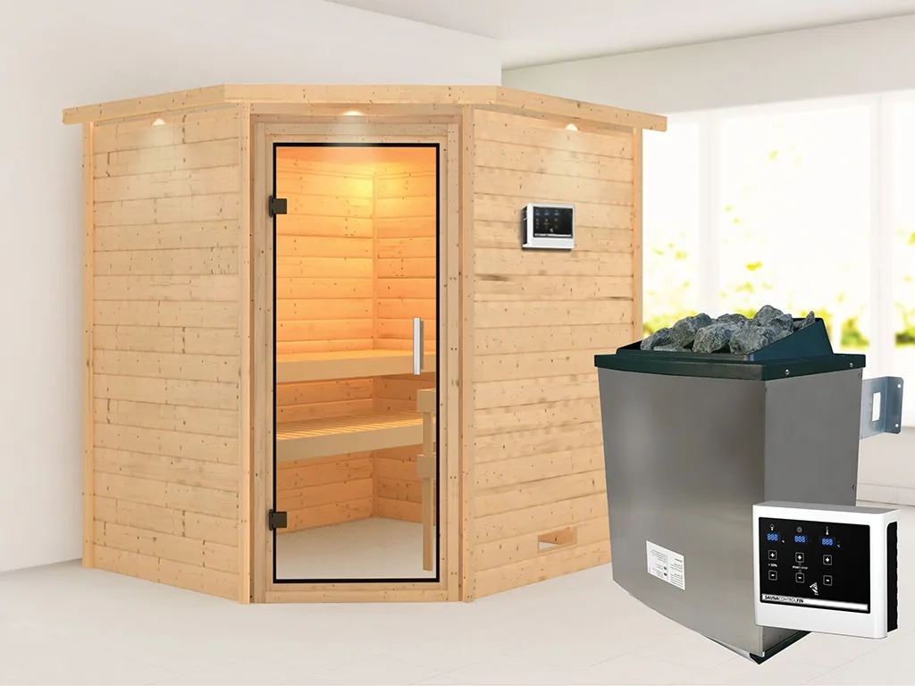 Sauna Massivholzsauna Mia mit Dachkranz, inkl. 9 kW Ofen mit externer Steuerung