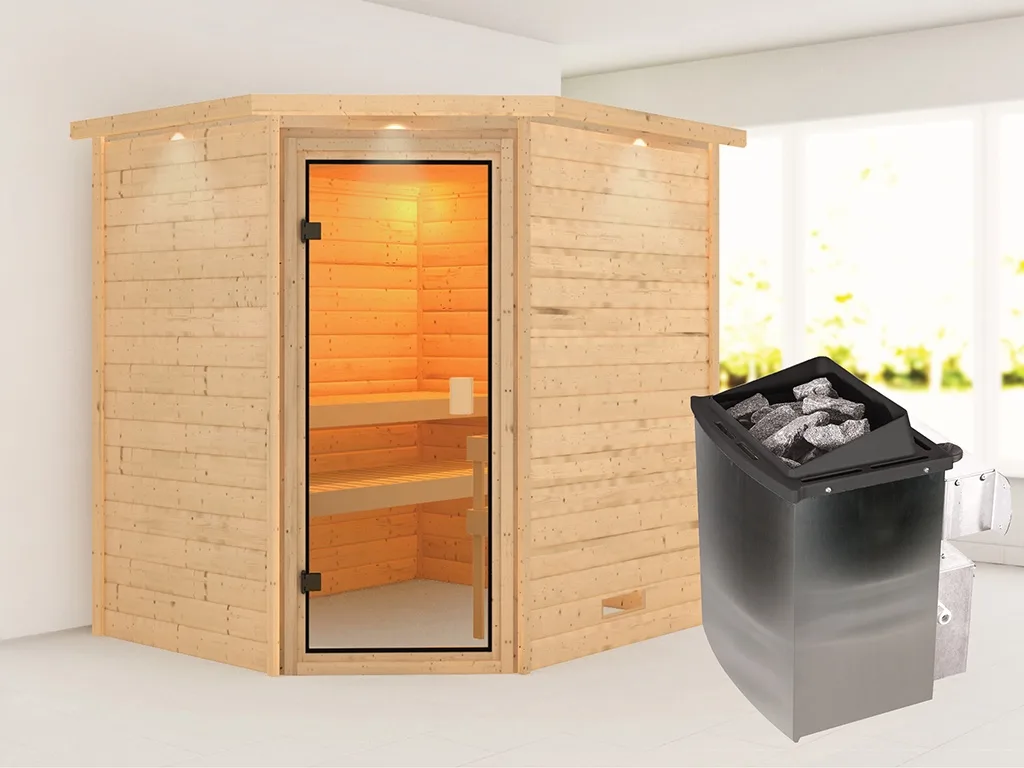 Sauna Massivholzsauna Mia mit Dachkranz, inkl. 9 kW Ofen mit integrierter Steuerung