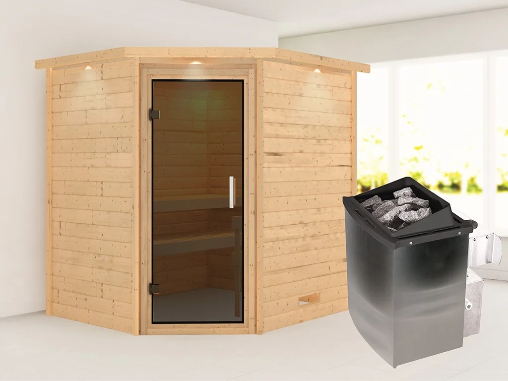 Sauna Massivholzsauna Mia mit Dachkranz, inkl. 9 kW Ofen mit integrierter Steuerung