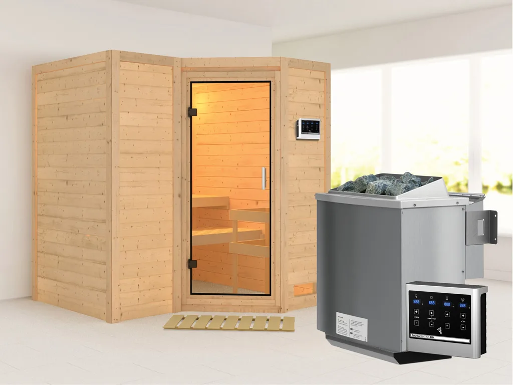 Sauna Massivholzsauna Sahib 1 Klarglas Ganzglastür + 9 kW Bio-Kombiofen mit ext.Strg