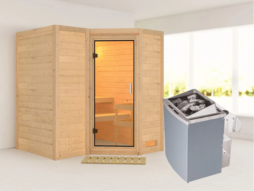 Sauna Massivholzsauna Sahib 1 Klarglas Ganzglastür + 9 kW Saunaofen mit Steuerung