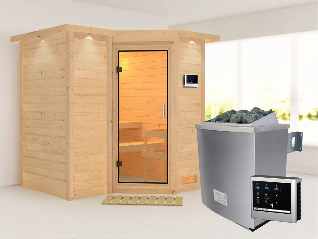 Sauna Massivholzsauna Sahib 1 mit Dachkranz, Klarglas Ganzglastür + 9 kW Saunaofen mit ext.Strg
